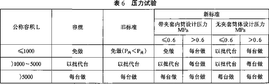 新標(biāo)準(zhǔn)對壓力試驗(yàn)作了較為詳細(xì)與合理的規(guī)定。具體見表6。注:以批代臺即:設(shè)備在提供連續(xù)30臺水壓試驗(yàn)數(shù)據(jù)合格后,經(jīng)制造單位技術(shù)負(fù)責(zé)人批準(zhǔn)可以批代臺。每15臺為1批。如不合格則恢復(fù)每臺水壓試驗(yàn),至連續(xù)30臺合格后再執(zhí)行以批代臺。舊標(biāo)準(zhǔn)每批抽2臺,容規(guī)各新標(biāo)準(zhǔn)均為每批抽1臺。