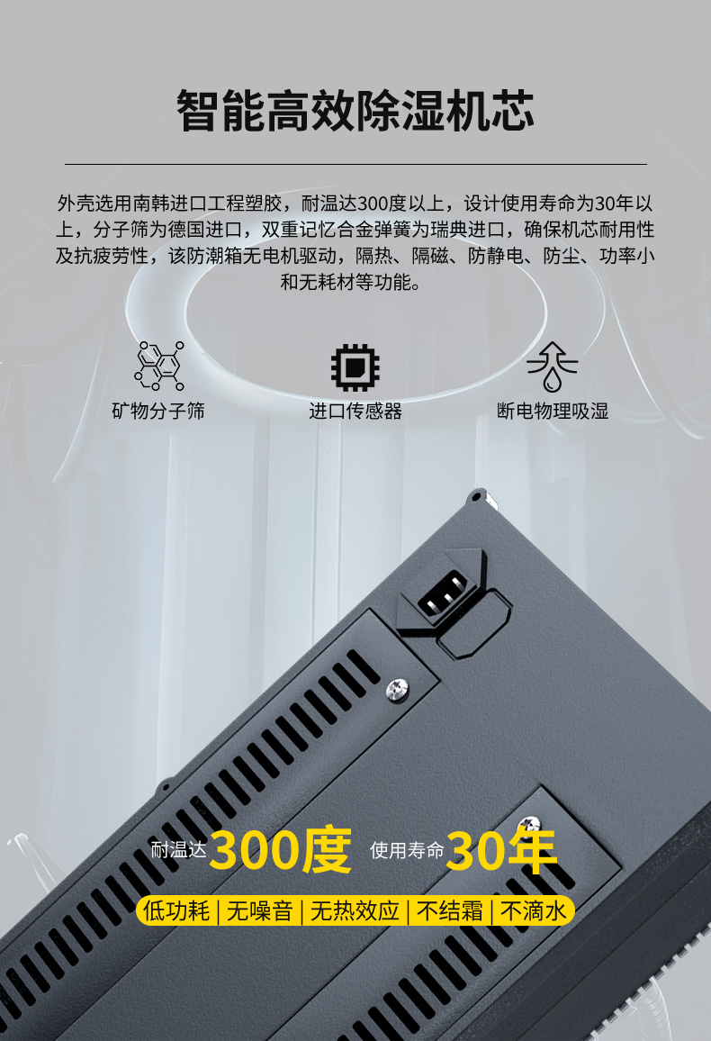 控濕機芯:外殼選用南韓工程塑膠,耐溫達300度以上,設(shè)計使用壽命為30年以上,分子篩為德國進口,雙重記憶合金彈簧為瑞典進口,確保機芯耐用性及抗疲勞性; 該防潮箱無電機驅(qū)動,隔熱﹑隔磁﹑防靜電﹑防塵﹑防盜﹑功率小和無耗材等功能,因此,該防潮箱具有環(huán)保﹑節(jié)能﹑靜音﹑無污染、不滴水。